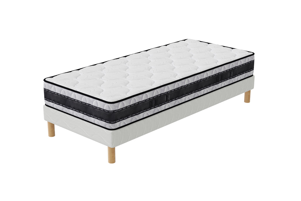 L'Ensemble Sommier + Matelas Medicare d'une hauteur de 22cm pour le matelas et 30cm pour le sommier offre un soutien équilibré en gardant un accueil souple pour un confort optimal. Son âme en mousse polyuréthane surmonté d’une couche de latex bénéficie d'un accueil souple pour moins de contrainte sur le dos. Garni d'une ouate mixte en fibre creuse hypoallergénique et ignifugé 200gr piqué, et d'une ouate mixte coton 550gr en fibre creuse hypoallergénique et ignifugée 200gr sur l'autre face qui elle assure un accueil ferme pour un meilleur soutien et répond à toute les normes sécuritaires et hygiéniques. Ce matelas est recouvert d’un coutil piqué en stretch hypoallergénique traité antibactérien et antiacarien. Les bandes latérales sont en tissu 3D respirant piqué avec 2 galons décoratifs et 4 poignées.